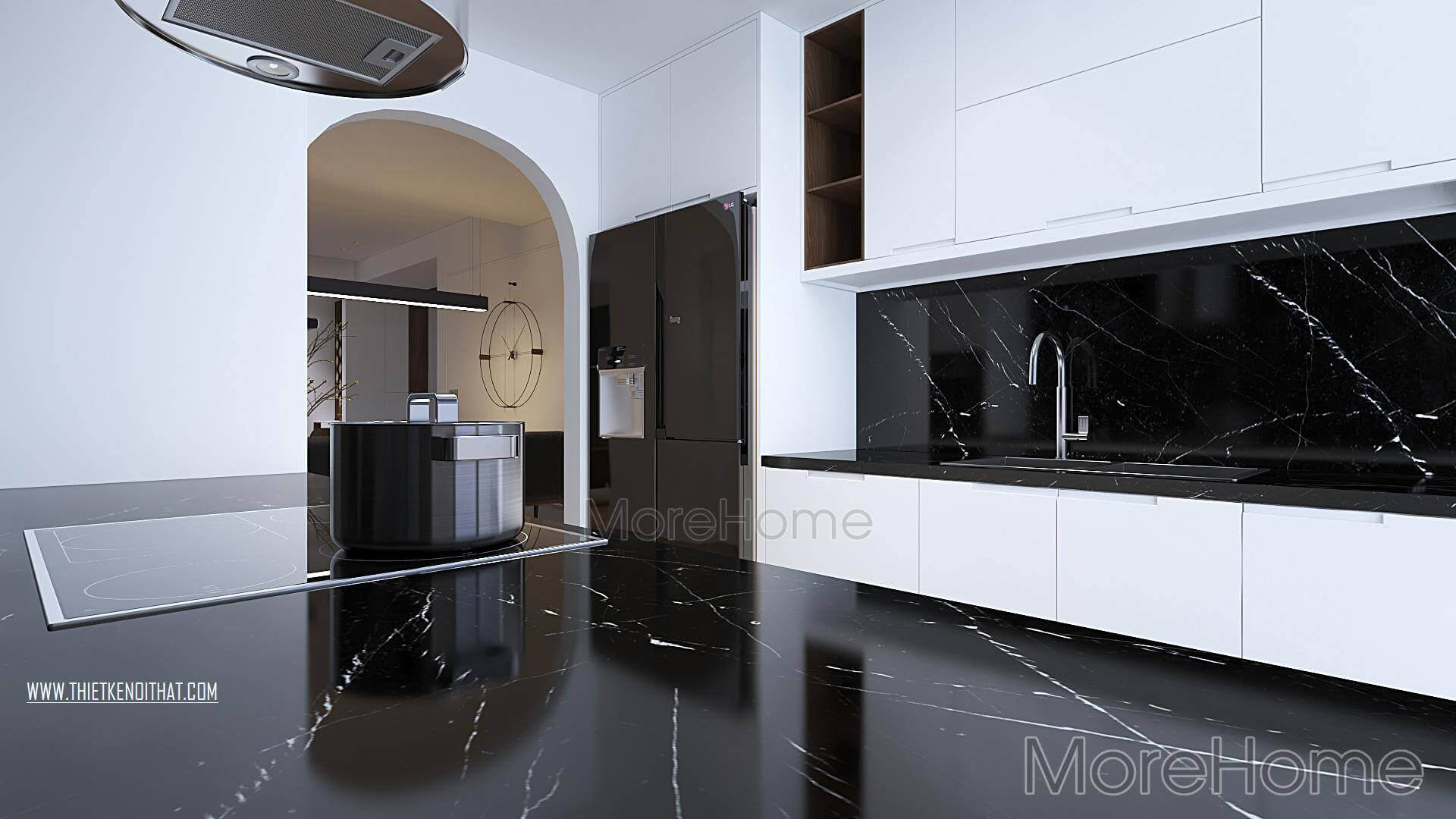 Mẫu đá nhân tạo hiện đại, sang trọng kết hợp với đồ bếp tạo nên sự nổi bật trong không gian.