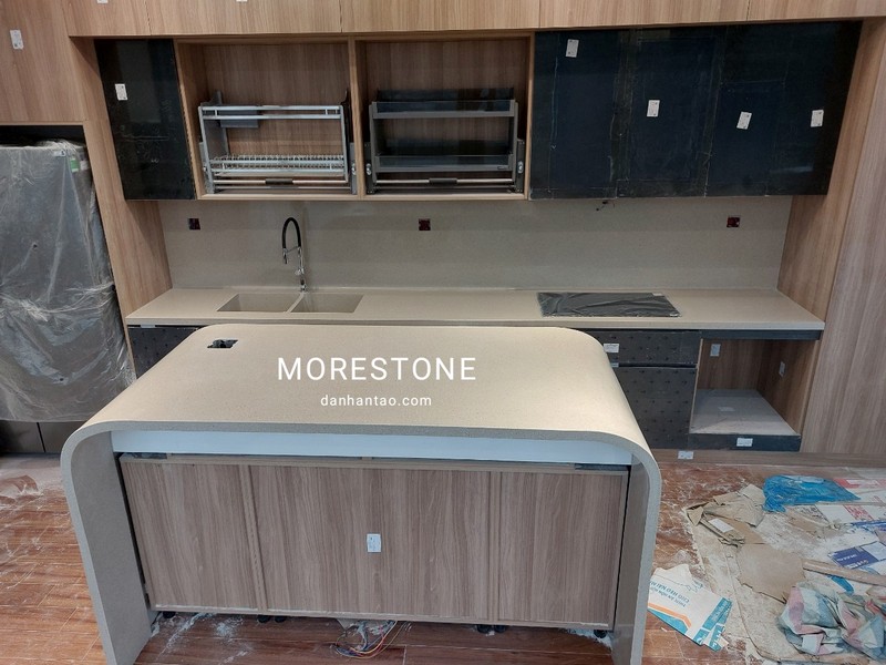 - Chậu rửa bằng đá đồng màu, cùng chất liệu với mặt đá bếp - tạo một tổng thể hài hòa liền khối