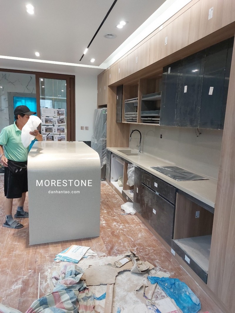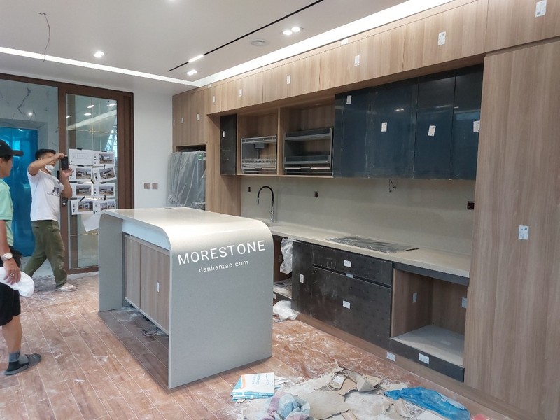 Mẫu đá bếp thi công tại nhà phố Võ Thị Sáu, Hà Nội. Kết hợp tất cả ưu điểm của dòng đá solid surface LG Hàn quốc