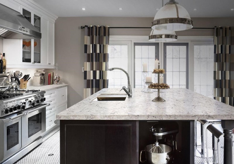Mặt bàn bếp và đảo bếp luôn là nơi được ứng dụng các mẫu đá nhân tạo gốc thạch anh nói riêng và các loại đá khác nói chung