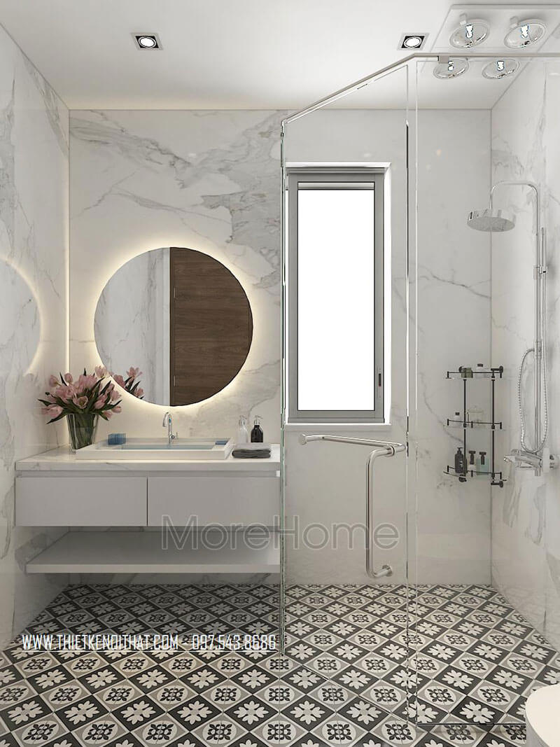 Thiết kế phòng tắm hiện đại với kính cường lực và đá ốp tường màu trắng vân mây tạo sự thoáng mát và sạch sẽ
