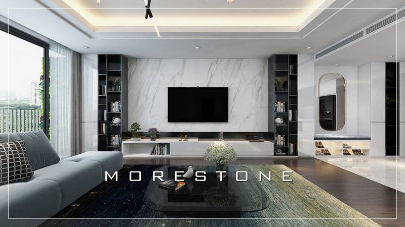 Đá ốp vách tivi mang đến sự sang trọng và điểm nhấn giúp không gian phòng khách trở nên nổi bật và ấn tượng hơn.