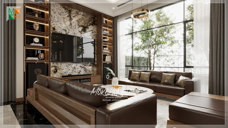 Tường phòng được sử dụng đá ốp tường vân mây tối màu giúp căn phòng khách của biệt thự có điểm nhấn trông rất đẹp mắt mà không kém sang trọng hiện đại trong đó.