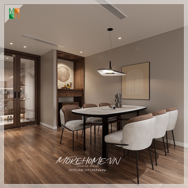 Bàn ăn kiểu hiện đại (Modern): Mẫu bàn ăn này có thiết kế tối giản, đường nét sắc nét và sử dụng chất liệu đa dạng như gỗ công nghiệp, kính, kim loại, đá, v.v., phù hợp với không gian phòng ăn hiện đại.
