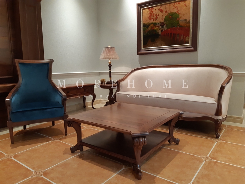 Gia chủ sẽ thoải mái và dễ chịu khi sử dụng sofa văng có tựa khung gỗ óc chó bọc nỉ màu be tân cổ điển với đường cong mềm mại, êm ái.