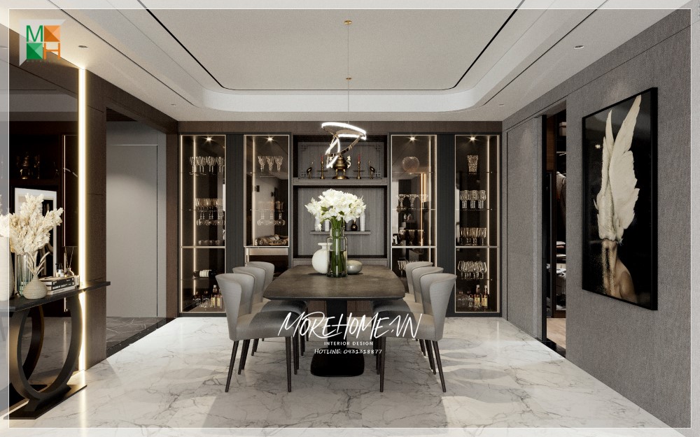 Thiết kế nội thất phòng ăn chung cư hiện đại với tone màu nội thất màu ghi tạo nên không gian ấm cúng và nhẹ nhàng