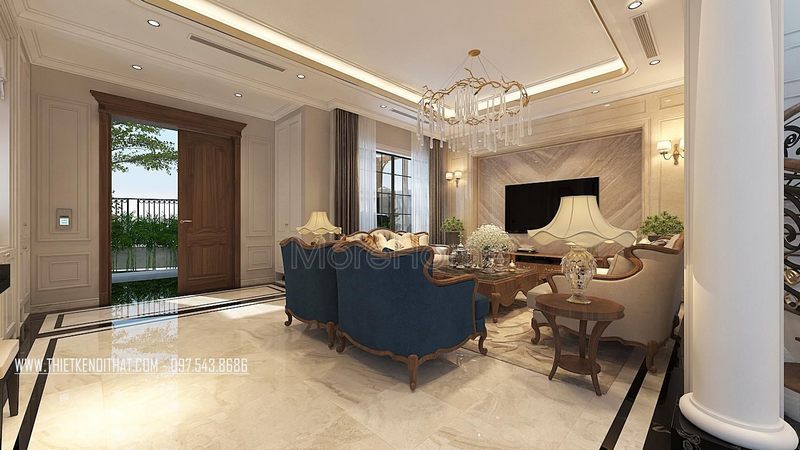 Cửa gỗ óc chó 2 cánh có phong cách tân cổ điển là lựa chọn hoàn hảo để trang trí phòng khách biệt thự cao cấp.