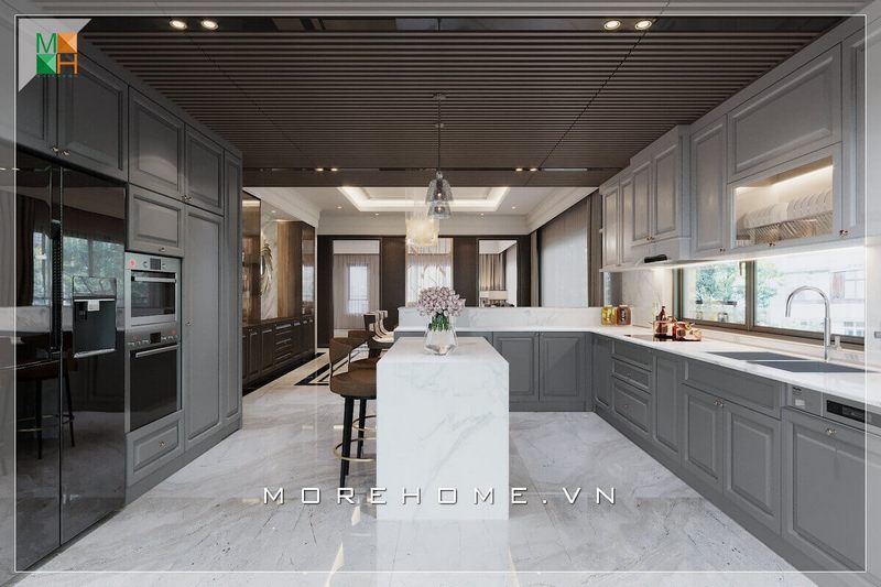 Mẫu thiết kế phòng bếp hiện đại bao gồm tủ bếp gỗ công nghiệp chữ L, mặt bàn đá nhân tạo cao cấp và kính ốp bếp in 3D màu xanh.