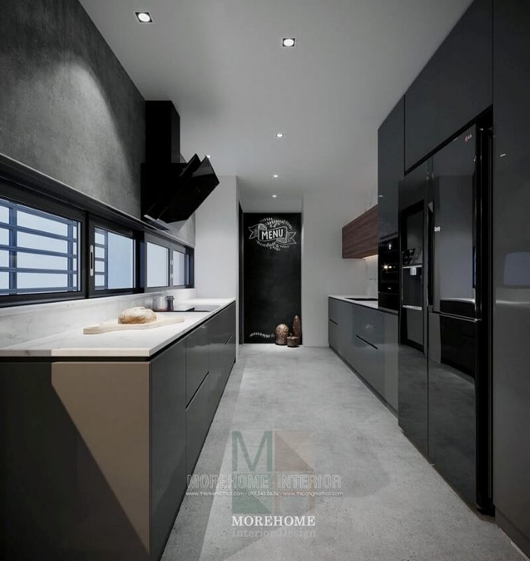Sắc trắng của tủ bếp đối lập với màu đen huyền bí của kính ốp, tạo nên sự sang trọng nhưng vẫn tiện lợi và sạch sẽ.