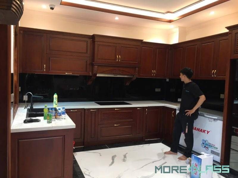 Việc thi công phòng bếp với một mẫu thiết kế tủ bếp chữ U phong cách tân cổ điển, mặt bàn bếp ốp đá nhân tạo cao cấp, kính cường lực ốp bếp màu đen bí ẩn sẽ góp phần tạo nên một không gian phòng bếp tinh tế, sang trọng và đẹp mắt cho các căn hộ, nhà phố, biệt thự.