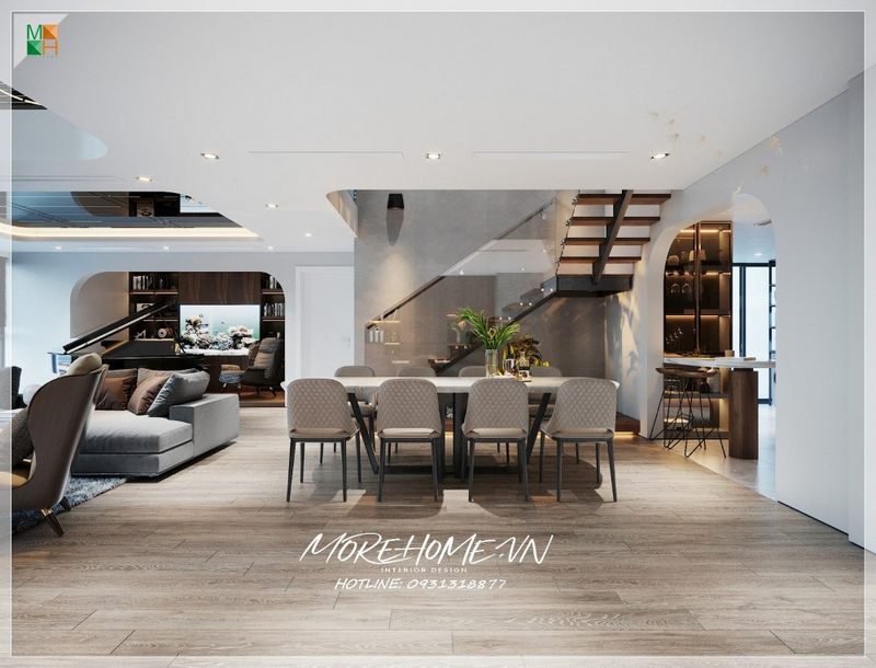 Không gian được thiết kế thông thoáng và sáng sủa sẽ tạo cảm giác dễ chịu khi ngồi vào bàn. Kết hợp với việc chọn màu sắc phù hợp, từ gam màu tối cho đến các tone pastel nhẹ nhàng, có thể tạo ra không gian ấm áp hay sang trọng theo ý muốn của gia chủ. Đồ đạc đi kèm như giỏ hoa, đĩa trái cây hay nến thơm cũng là điểm nhấn quan trọng tôn lên vẻ đẹp của không gian bàn ăn.