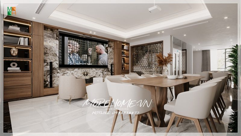 Sàn nhà được thiết kế bằng đá tự nhiên màu trắng cao cấp giúp tạo ra một không gian thoáng mát, sáng và sạch sẽ hơn.
