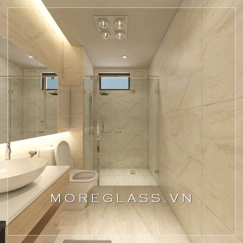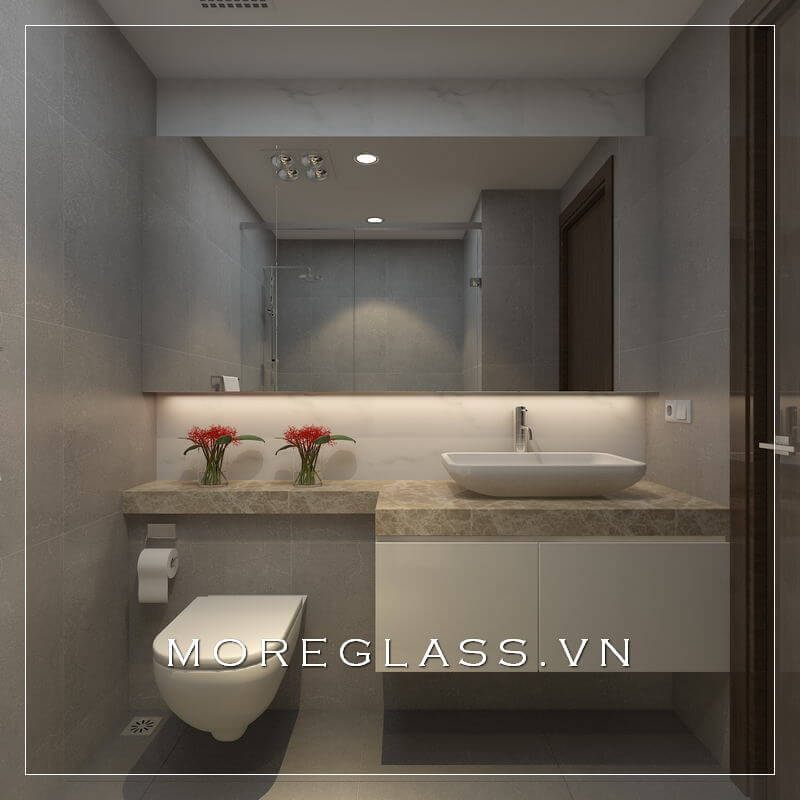 Thiết kế nhà tắm và nhà vệ sinh sử dụng gương to hình chữ nhật rất hiện đại, cảm giác căn phòng tắm rộng hơn thoáng hơn.