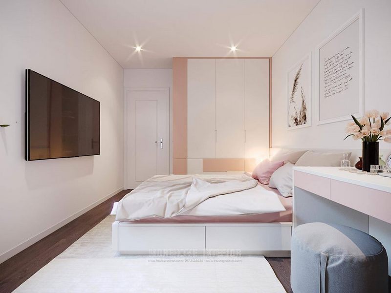 Cửa gỗ 1 cánh màu trắng được tô điểm bởi tone màu tương ứng với nội thất phòng ngủ, tạo nên sự liên mạch và tinh tế cho không gian.