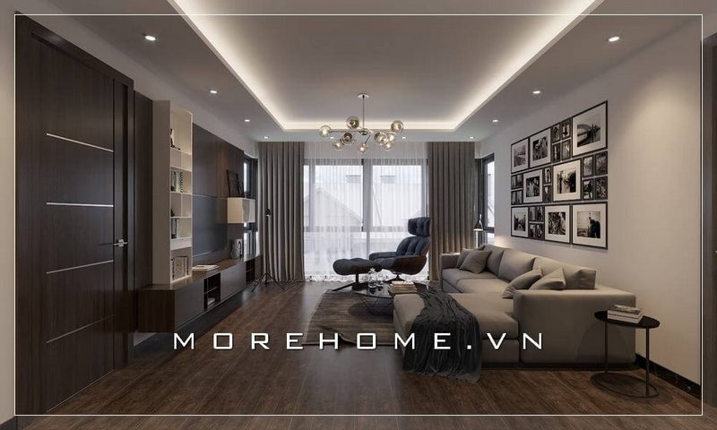 KTS MoreHome đã tạo ra một mẫu thiết kế phòng khách chung cư đẹp mắt với nội thất hiện đại tông màu trắng xám sang trọng và đẳng cấp.