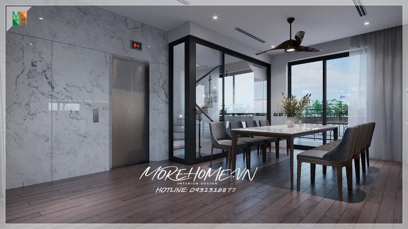 Phân cách ngăn chia phòng ăn với cầu thang bộ bên ngoài nhờ vách ngăn kính tạo không gian mở rộng đưa hai không gian gần nhau được nhiều gia đình ưa chuộng bởi có đọ chịu lực tốt chống va đập chịu trọng tải lớn có khả năng chống bể vỡ mang lại an toàn tuyệt đối.