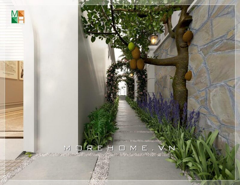 Mẫu thiết kế kiến trúc biệt thự sân vườn đẹp, độc đáo. Ý tưởng thiết kế lối đi hông nhà sân vườn ấn tượng với 2 hàng hoa khoe sắc với đá lát nổi bật.