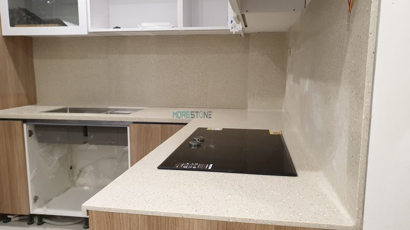 Đá ốp mặt bếp đá nhân tạo màu trắng với khả năng chống nước cao độ bền sử dụng cao tiện lợi cho gia chủ khi sử dụng và tạo cho không gian vẻ đẹp cao cấp.