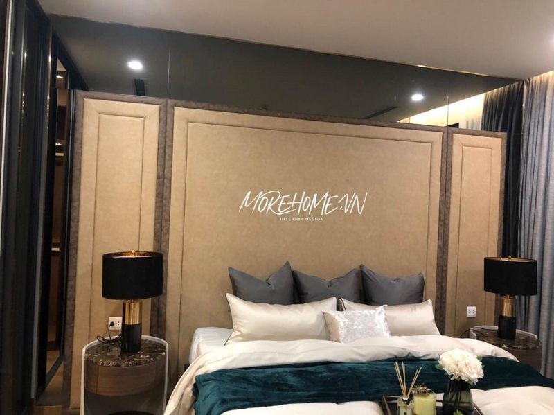 Hình ảnh thể hiện công việc thi công nội thất phòng ngủ hiện đại với sử dụng gỗ công nghiệp tại căn hộ chung cư Thăng Long Number One Hà Nội được thực hiện bởi Morehome - một đơn vị thi công trực tiếp.