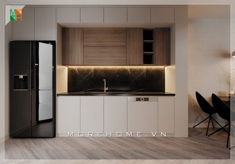 Diện tích không quá lớn của khu vực rửa đồ trong căn bếp của chung cư đã được thiết kế theo phong cách hiện đại và lựa chọn thông minh của tất cả các gia chủ.